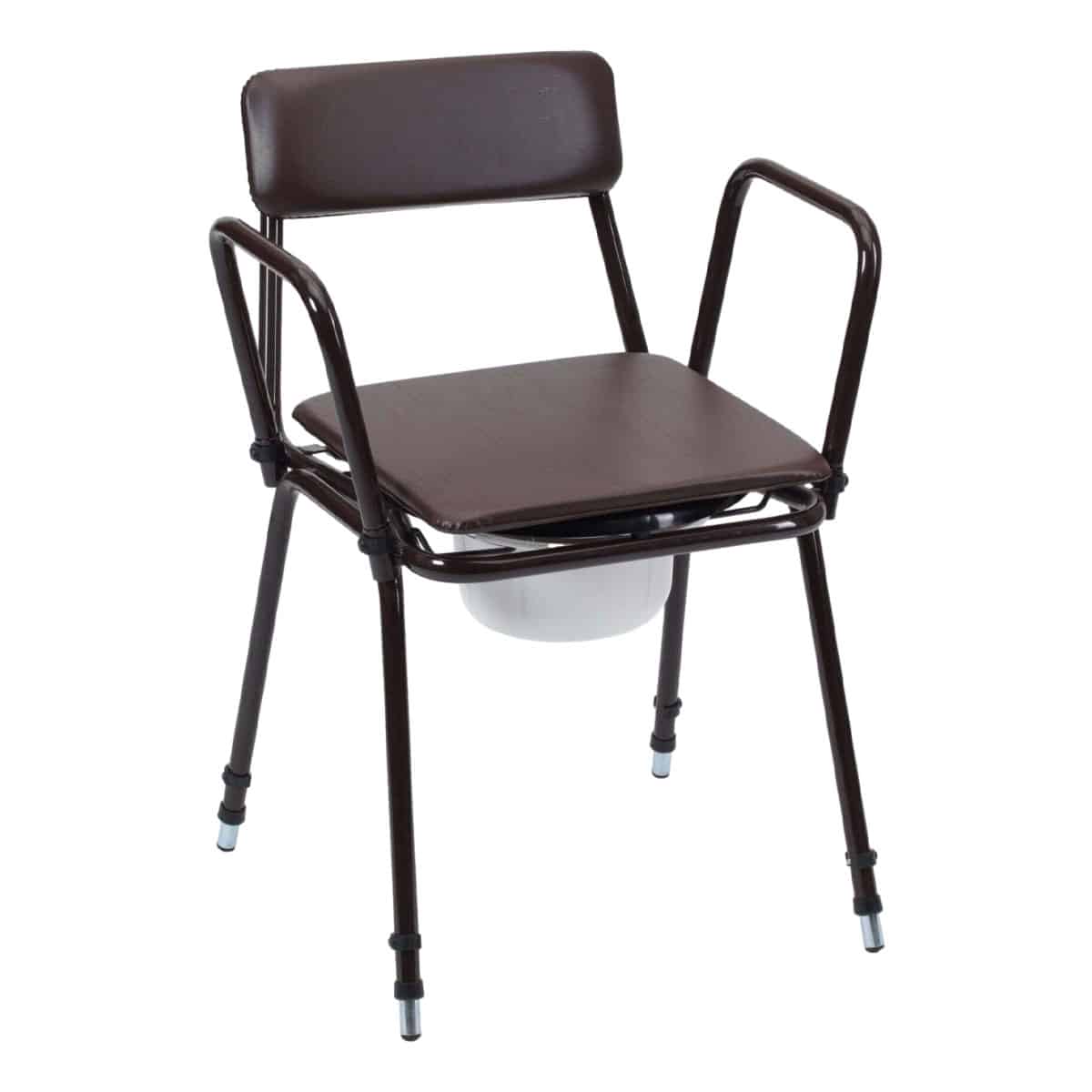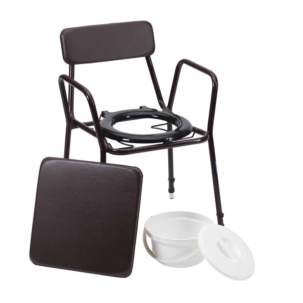 521A Adjustable Height Commode is a modern, attractive commode. Offering comfort and stability within any home or institutional environment. Padded blue seat cover and clip-on black toilet seat are easily removed for cleaning. Commode pan with handle is simple to remove for waste disposal. Height adjustment allows the commode to be tailored to the required position for the user. Available with or without removable armrests.