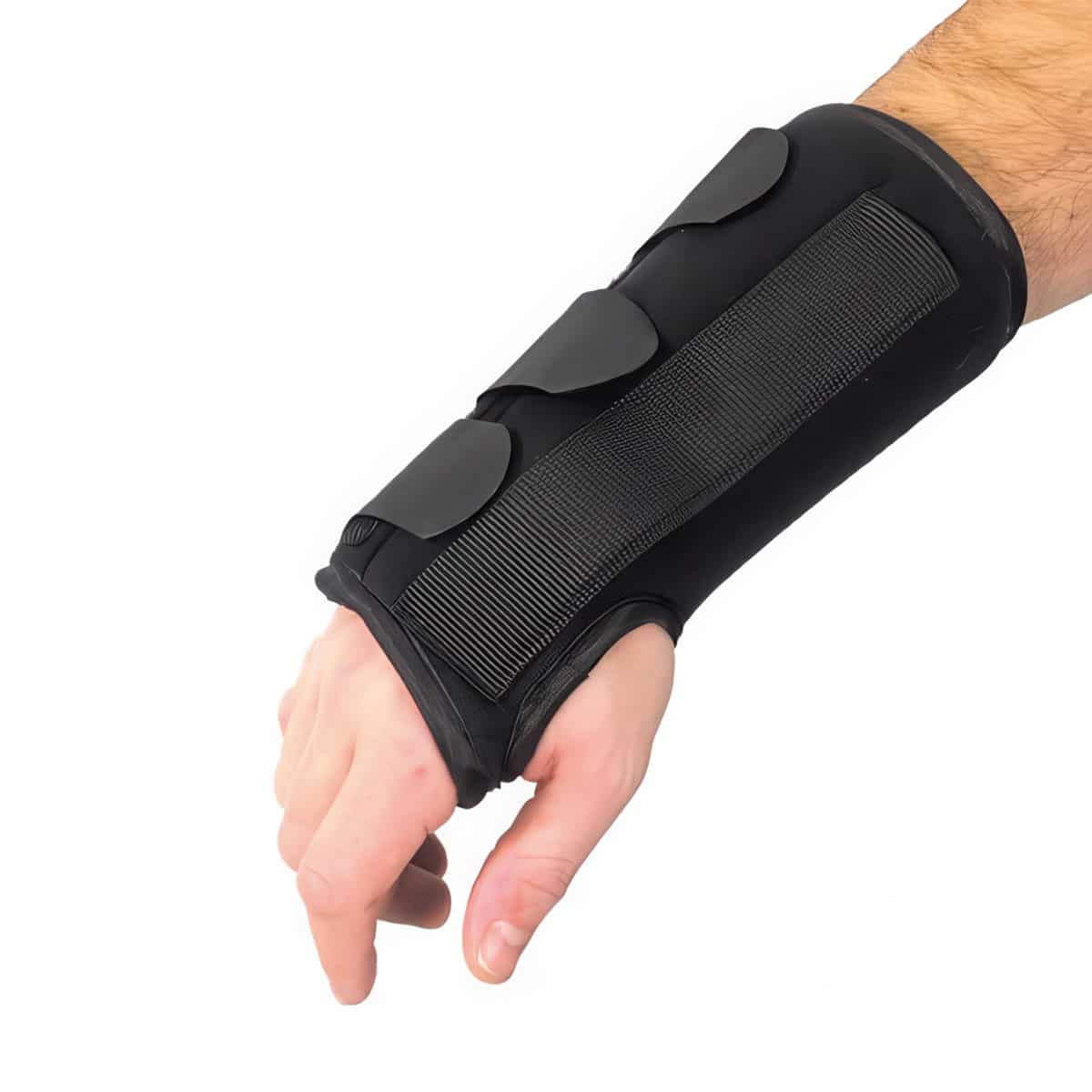 Position the brace so that the metal splint is on the inside of the wrist. The hand section of the splint should be placed in the mid-lower part of the palm. Wrap the fastener straps around the forearm and secure, then wrap the locking strap around the splint and secure.
