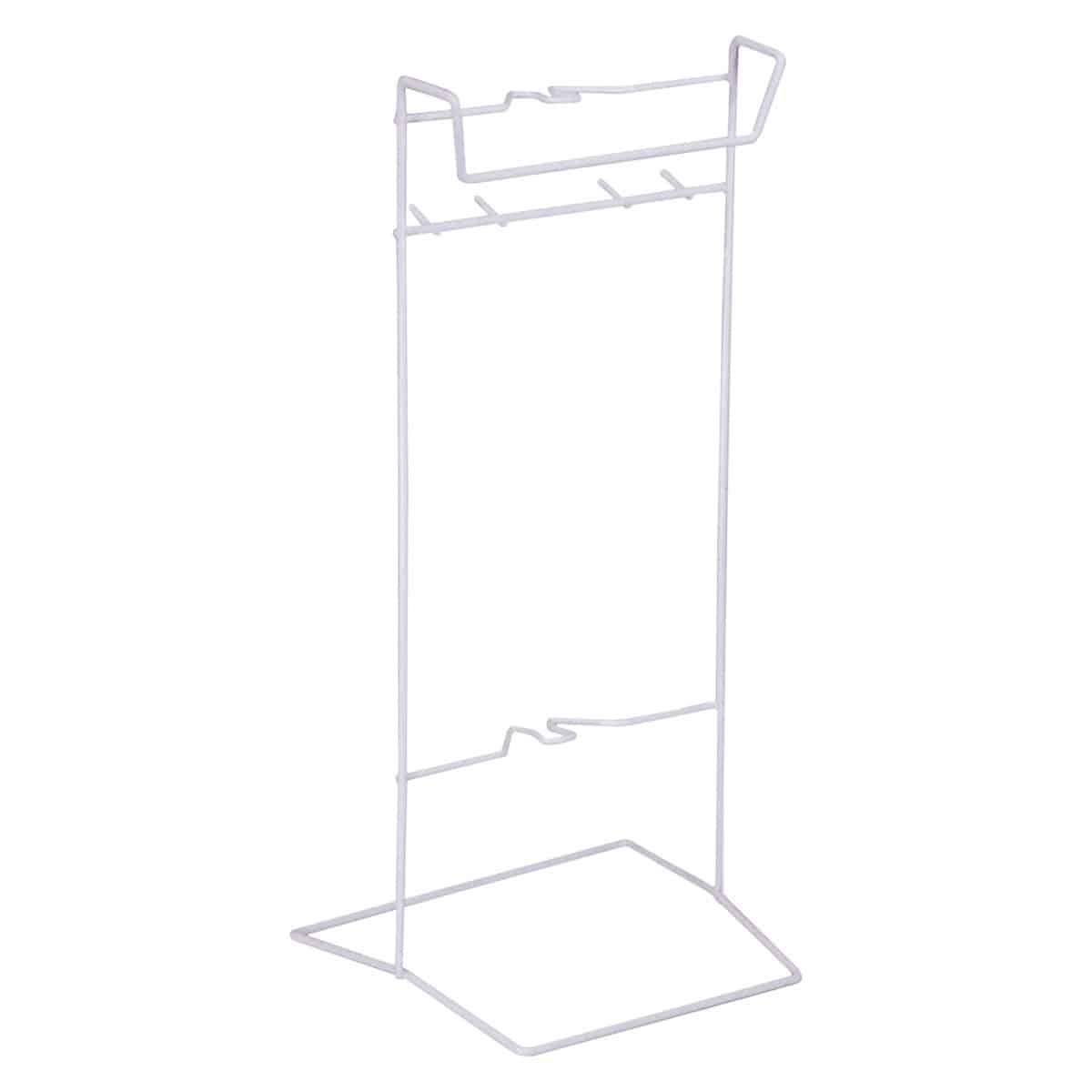 Plastic-coated wire construction economy range Catheter Bag stand. Vertical frame with horizontal rectangular frame base. Integral carry handle. Suitable for use within hospitals and the care/nursing home industry. Economy range.