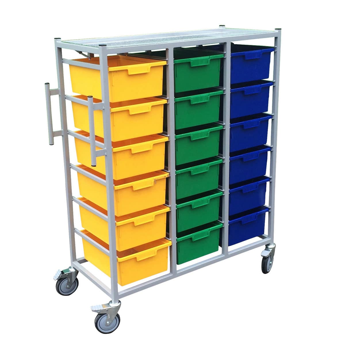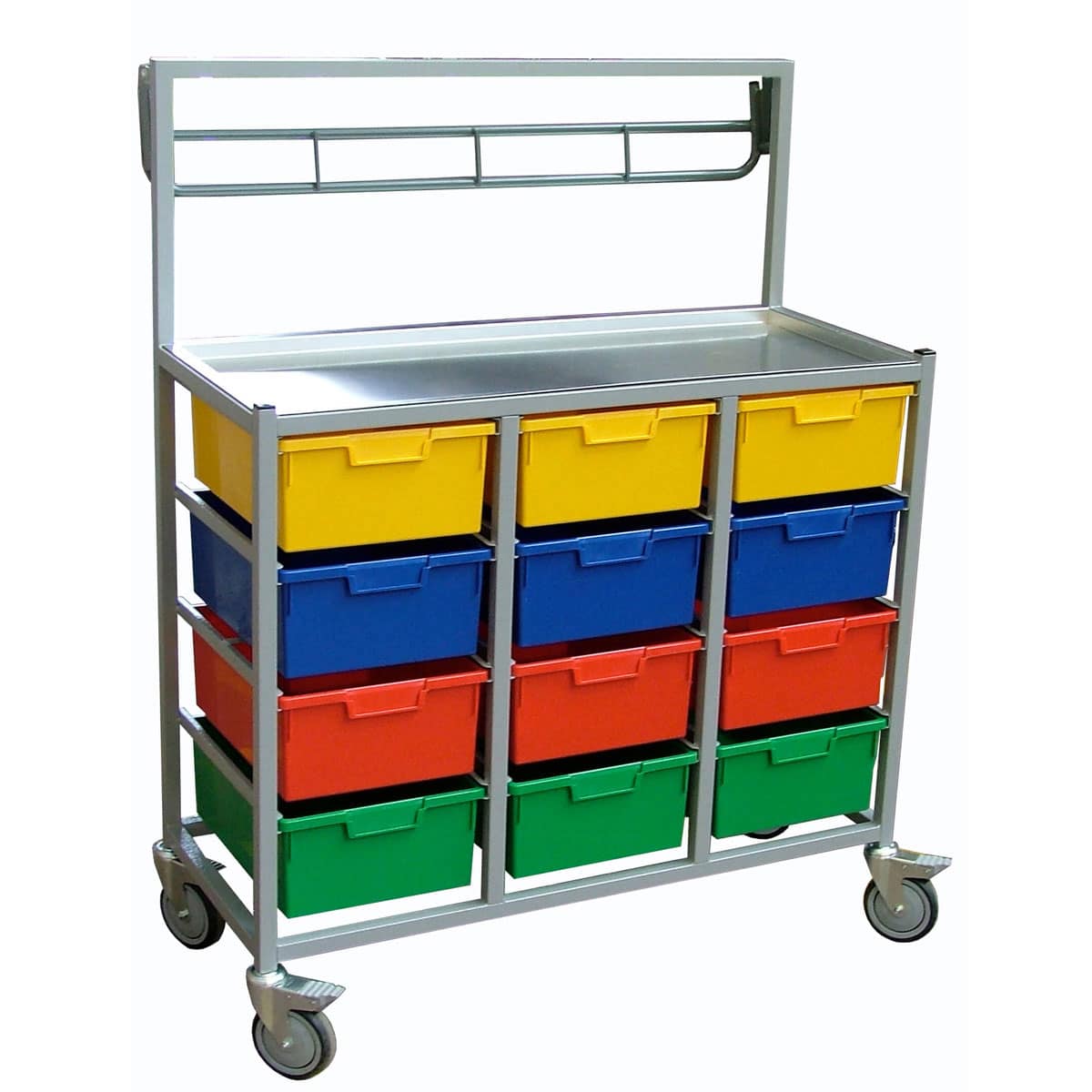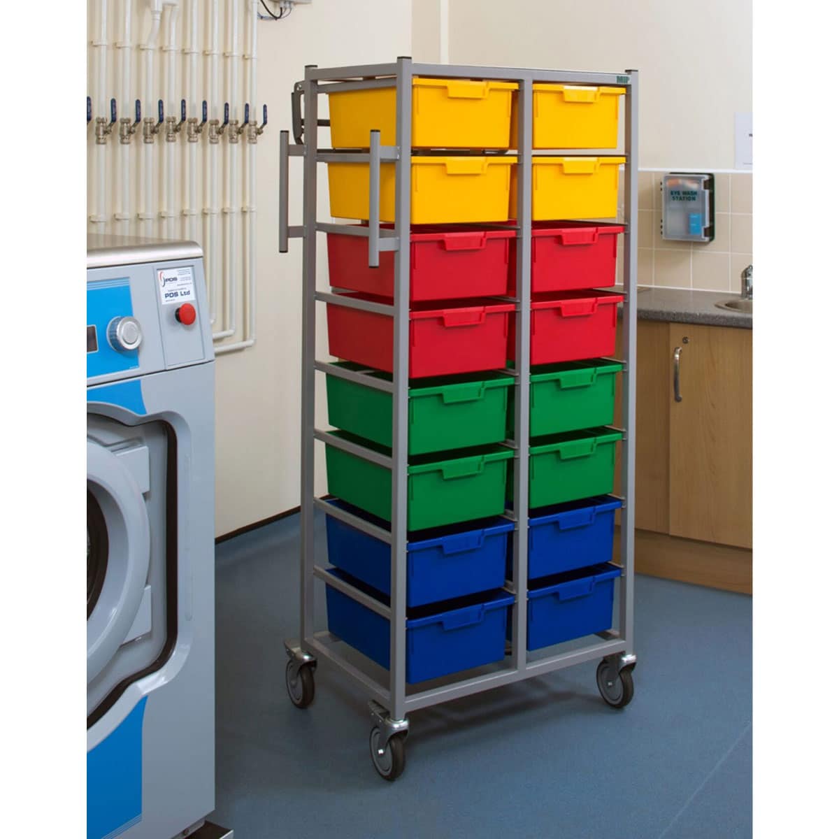 For the distribution of clean personal clothing, enabling separation and distribution of individuals clothing. The Karri-Carts are made from a light weight, high quality powder coated steel. They come complete with a selection of coloured trays, to help with sorting. It also has a robust hanging rail to transport products on hangers. (KCart/Combi does not include a hanging rail).