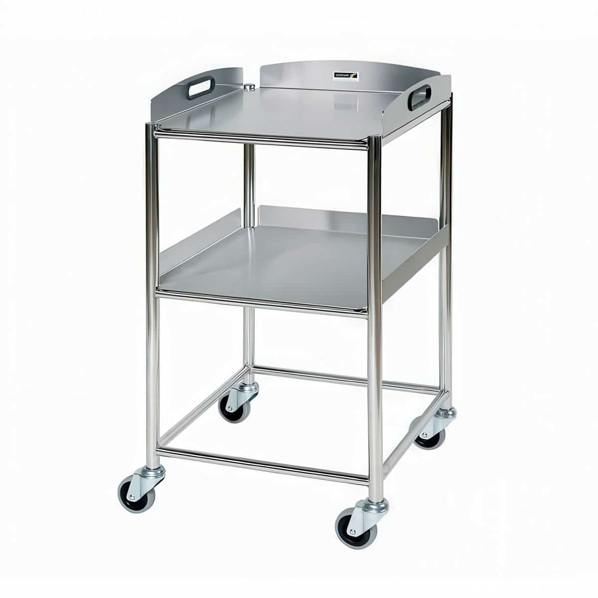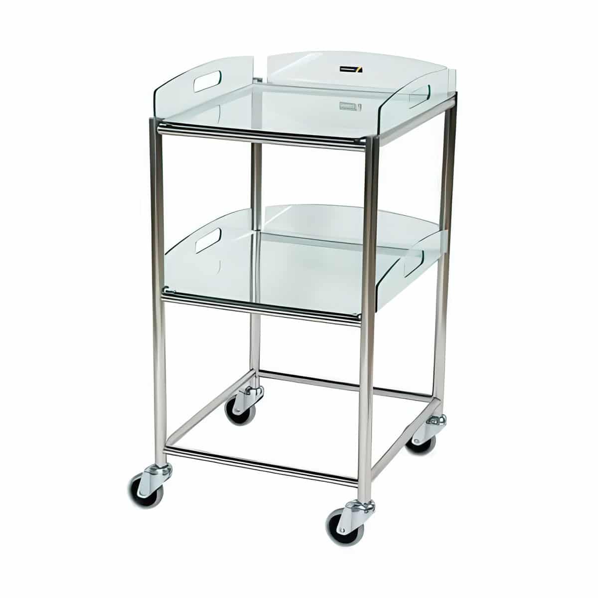 Polished stainless steel framed Sunflower Surgical Trolleys (304 Grade). Available with either stainless steel trays or unique glass effect safety trays.