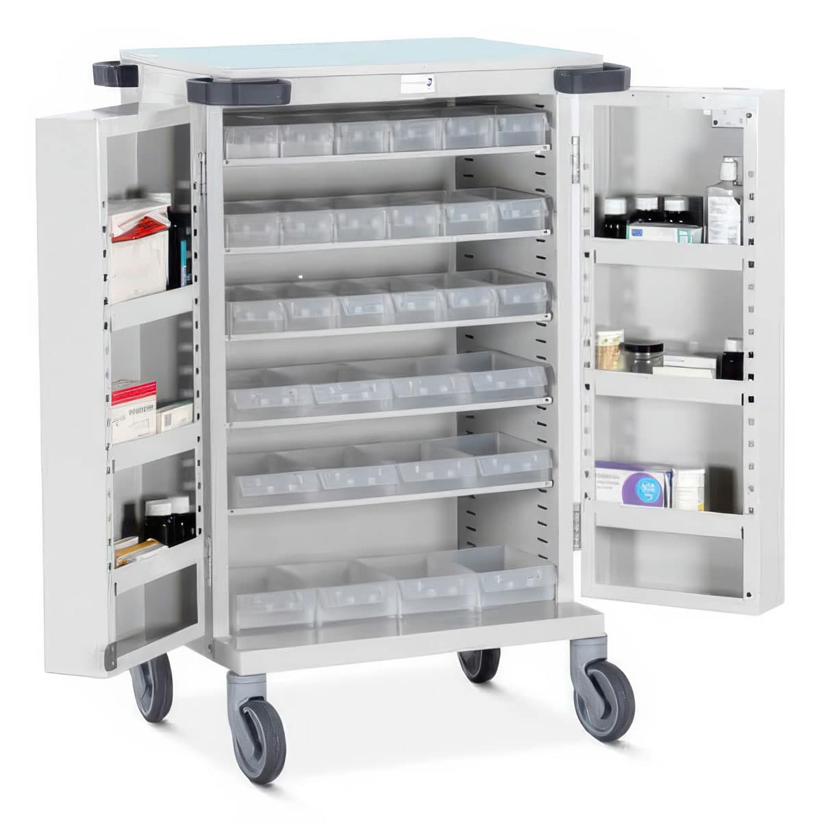 Unit Dosage Trolleys – Tray System – 30 AC Trays. Drug Trolleys. With either a high-security bolt or electronic push-button lock.